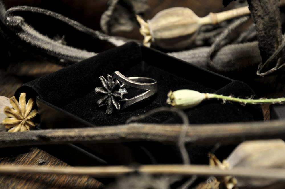 Sterling silver ring with eight-pointed opium poppy ‘star’, elegantly framed by the split, tapering ring band.